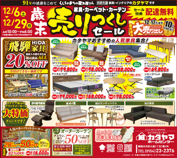 今年の感謝をこめましてブランド家具や道産のソファ、国産のベッドなどとってもお安くなっています!