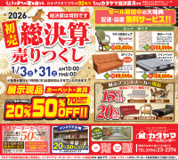 いつもありがとうございます、カタヤマホームセンターです。1月営業日のお知らせです。1月31日(土)まで「総決算売りつくしセール」開催中です!皆さまのご来店を心よりお待ち申し上げます。